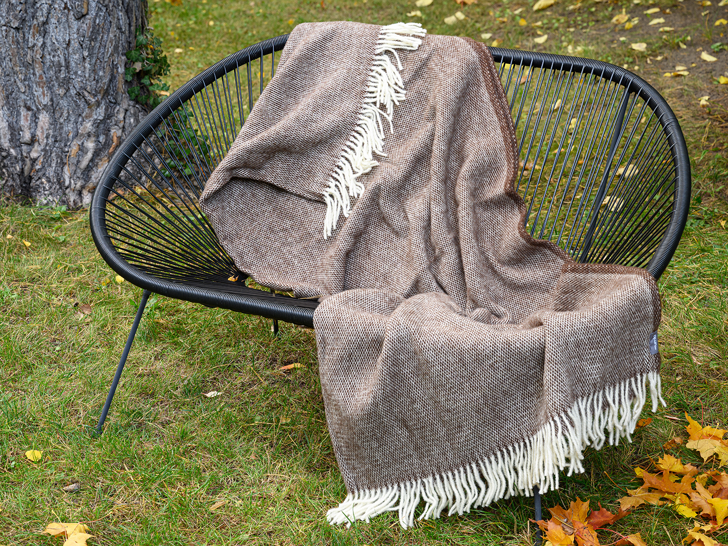 Hnědá deka z vysoce kvalitní merino vlny. Mimořádně teplá, hebká a příjemná na dotek – ideální na chladné večery.