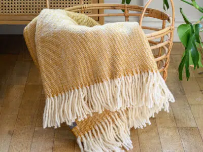 Hořčicová deka z vysoce kvalitní merino vlny. Mimořádně teplá, hebká a příjemná na dotek – ideální na chladné večery.