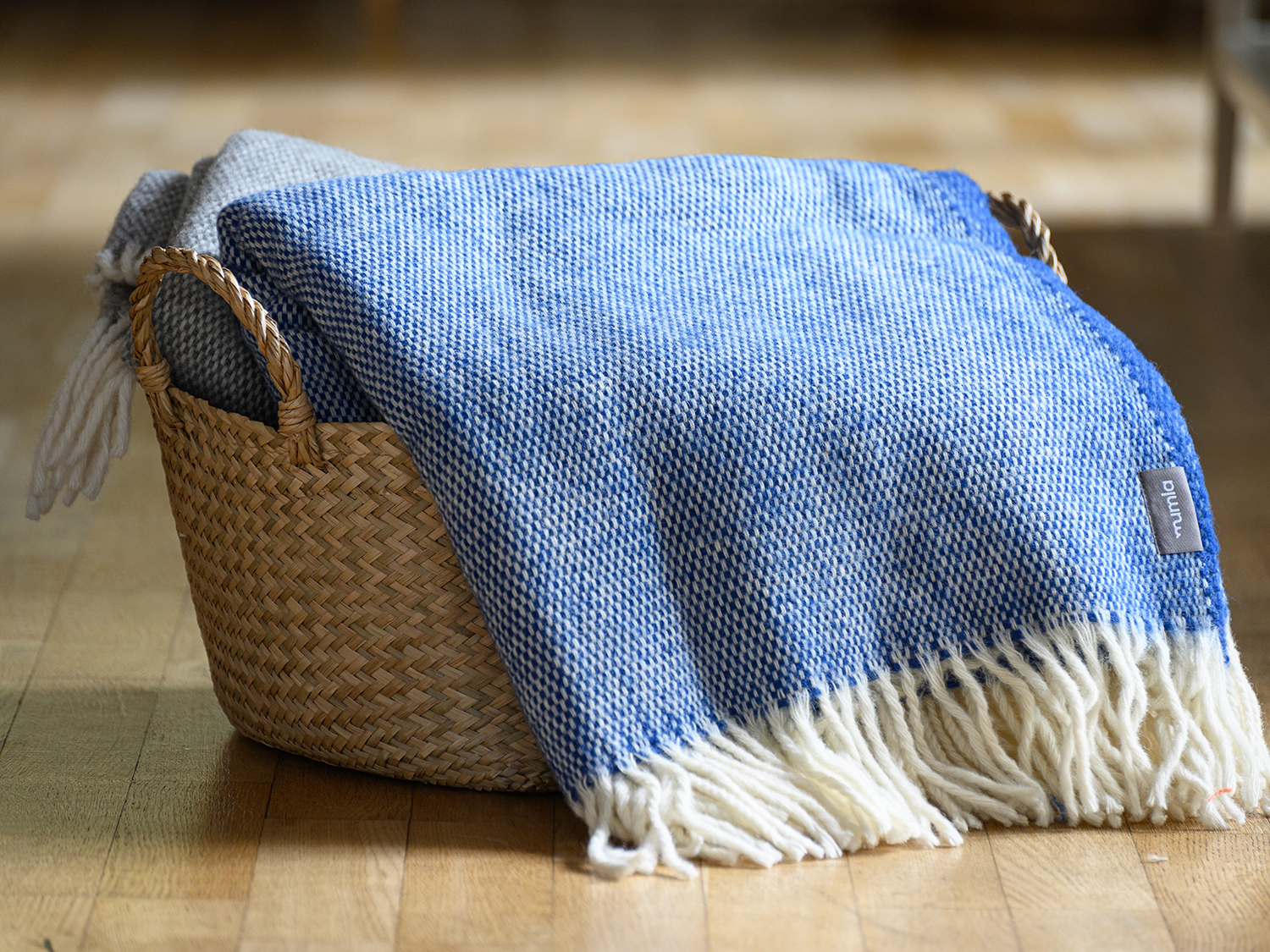 Modrá deka z vysoce kvalitní merino vlny. Mimořádně teplá, hebká a příjemná na dotek – ideální na chladné večery.